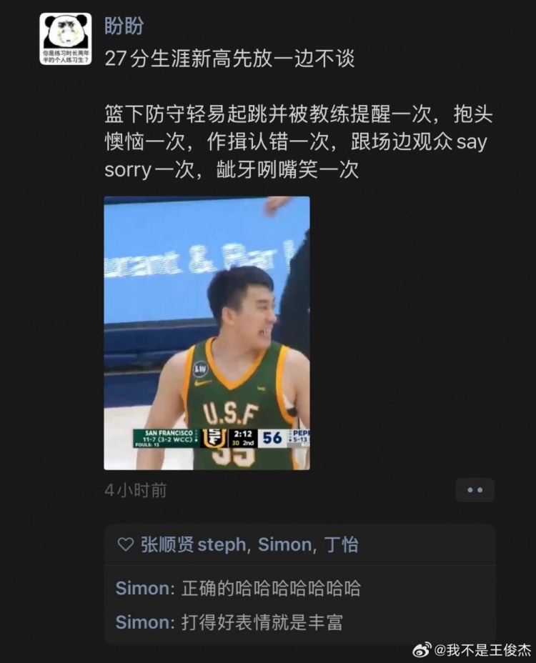 1月11日讯 NCAA常规赛,旧金山大学以80-60大胜佩珀代因大学。此役,中国球员、旧金山大学前锋王俊杰迎来生涯之夜,重回首发的他攻防建功;全场比赛,王俊杰上阵33分钟14投10中,三分球9中7,砍下27分5篮板1盖帽,得分和三分都创个人生涯新高。赛后,王俊杰发博转发打趣调侃自己的言论,并配文道:“Genius(天才)。”...